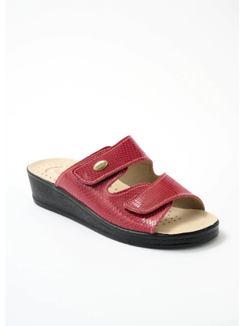 Šľapky. 2 suché zipsy vám umožnia dokonalé prispôsobenie šľapky k nohe. Zvršok z hovädzej kože. Polyesterová podšívka. Kožená stielka na pene. Protišmyková, mäkká podrážka vyrobená z plastu. Klinový podpätok cca 4 cm.