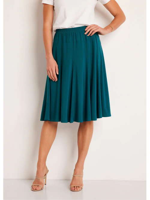 Štýlová sukňa, ktorá pekne sedí na postave. Elastický pás a volán. Rozšírený strih s 10 klinmi. Vyrobené vo Francúzsku. Dĺžka cca 65 cm. Možno prať v práčke na 30 ° C. Úplet: 95% polyester, 5% elastan.