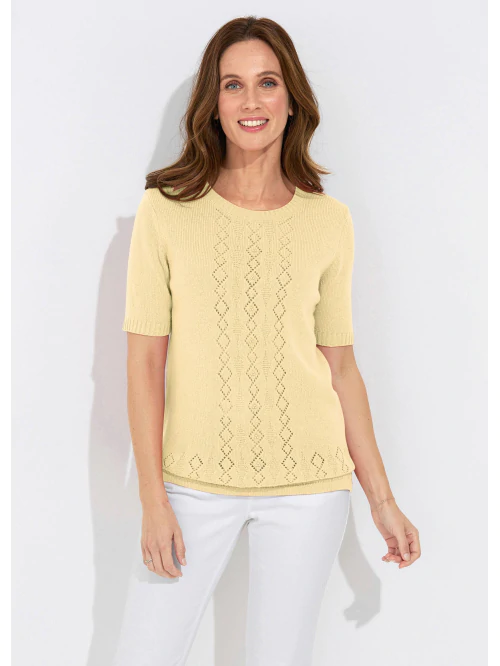 Sveter s krátkym rukávom z mäkkého a príjemného úpletu. Predĺžený strih s efektným, ažúrovým vzorom, zdobený perličkami. Vysoko všité rukávy s rebrovaným lemom. Spodok svetrov je ukončený tunelovým riasením. Okrúhly výstrih s vrúbkovaným lemom. Dĺžka cca 62 cm. Zadná časť z hladkého džerseju. Možno prať v práčke na 30°C. Akryl.