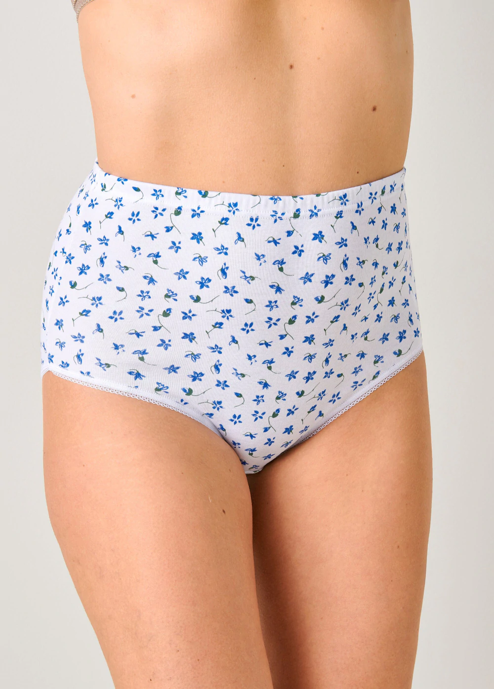 Sada 4 párov vzorovaných nohavičiek s vysokým pásom, rovnakej veľkosti a rôznej farby (2 páry červených + 2 páry modrých). Vyšší model s vysokým elastickým pásom, elastický rebrovaný prúžok okolo stehien. Veľmi pružná rebrovaná česaná bavlna. Rozkrok podšitý bavlnou. Možno prať v práčke na 40 ° C.
