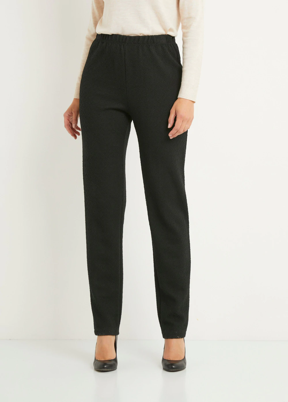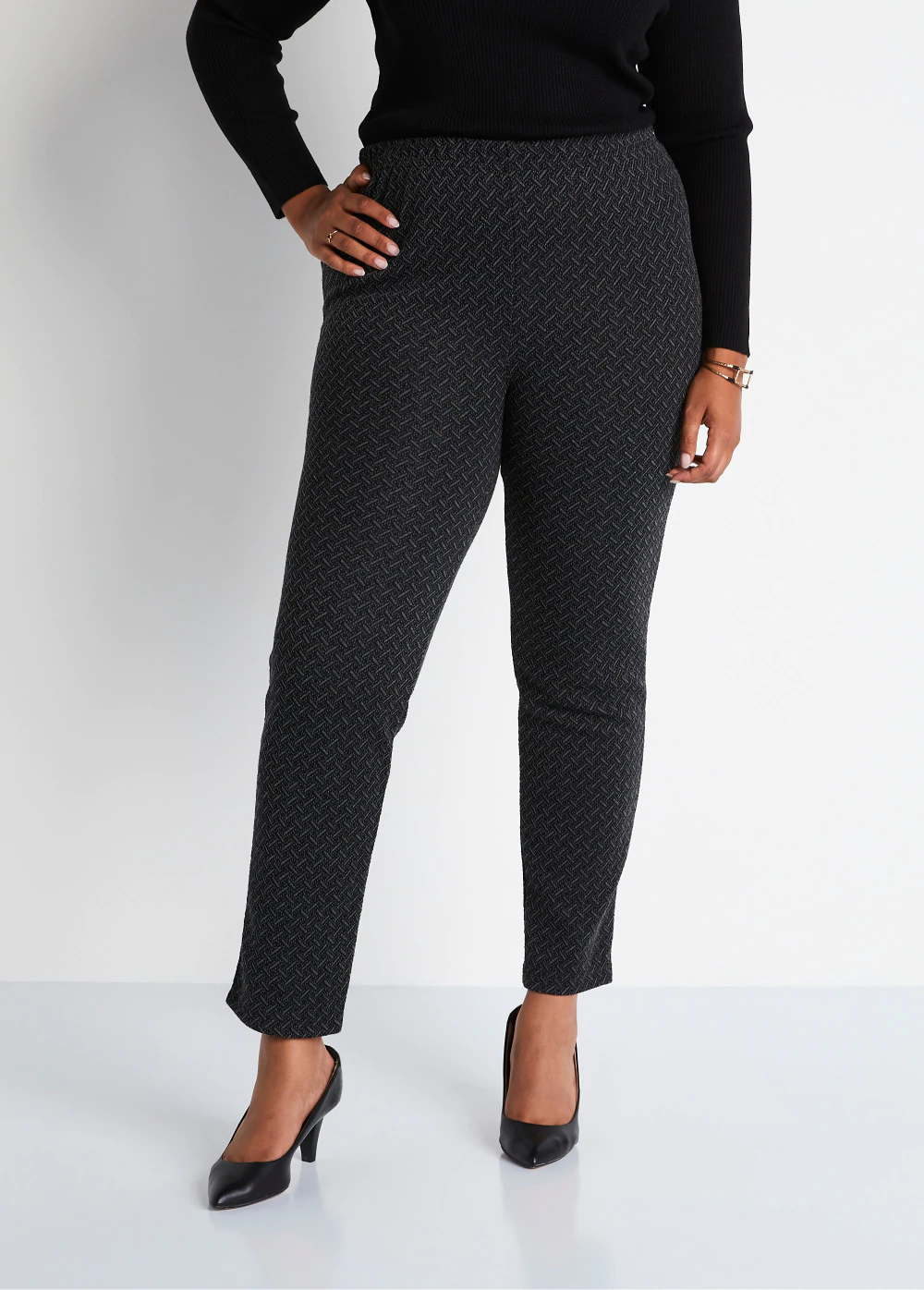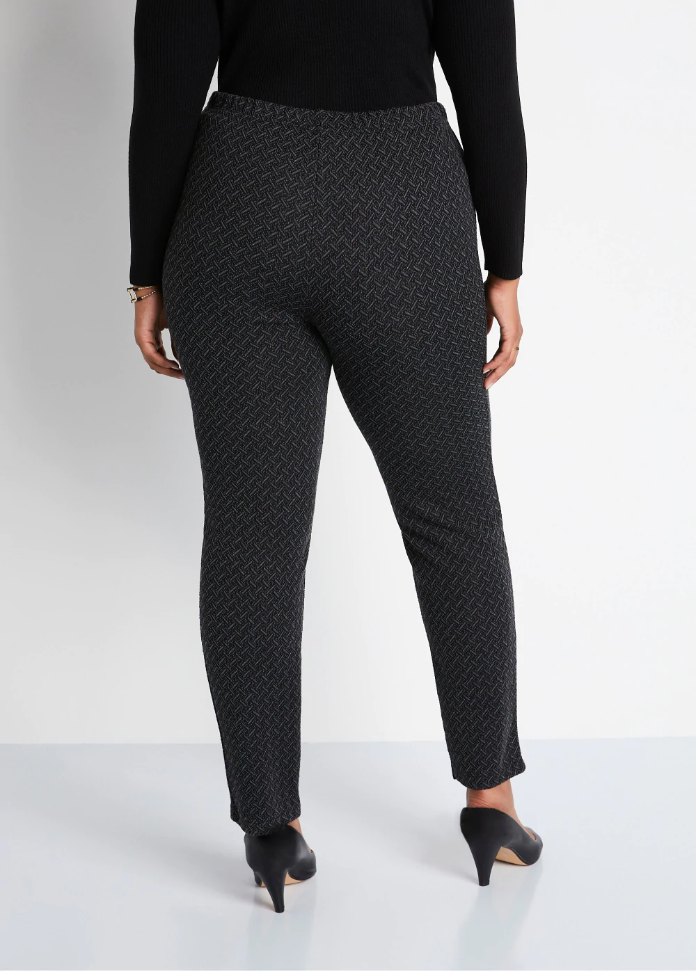 Nohavice, hladké alebo žakárové, pružný material obohatený vlnou, elastický pás. Ukončené dvojitým prešitím. Vnútorná dĺžka nohavíc cca 72 cm. Možno prať v práčke na 30 ° C. Hladký materiál: 63% akryl, 27% vlna, 9% polyester, 1% elastan. Žakár: 78% akryl, 12% vlna, 9% polyester, 1% elastan.