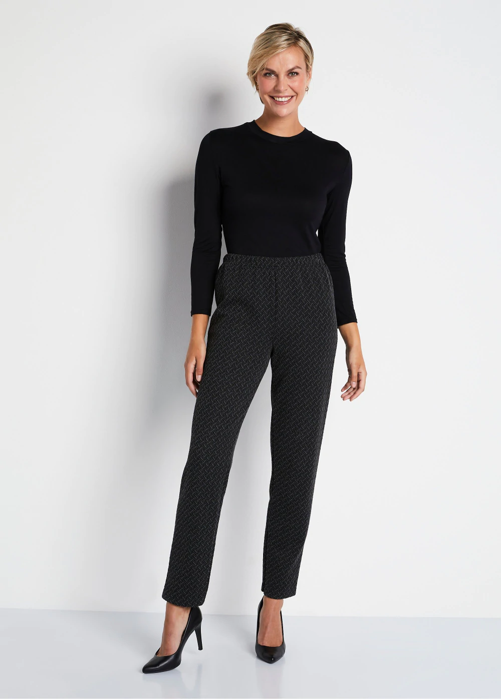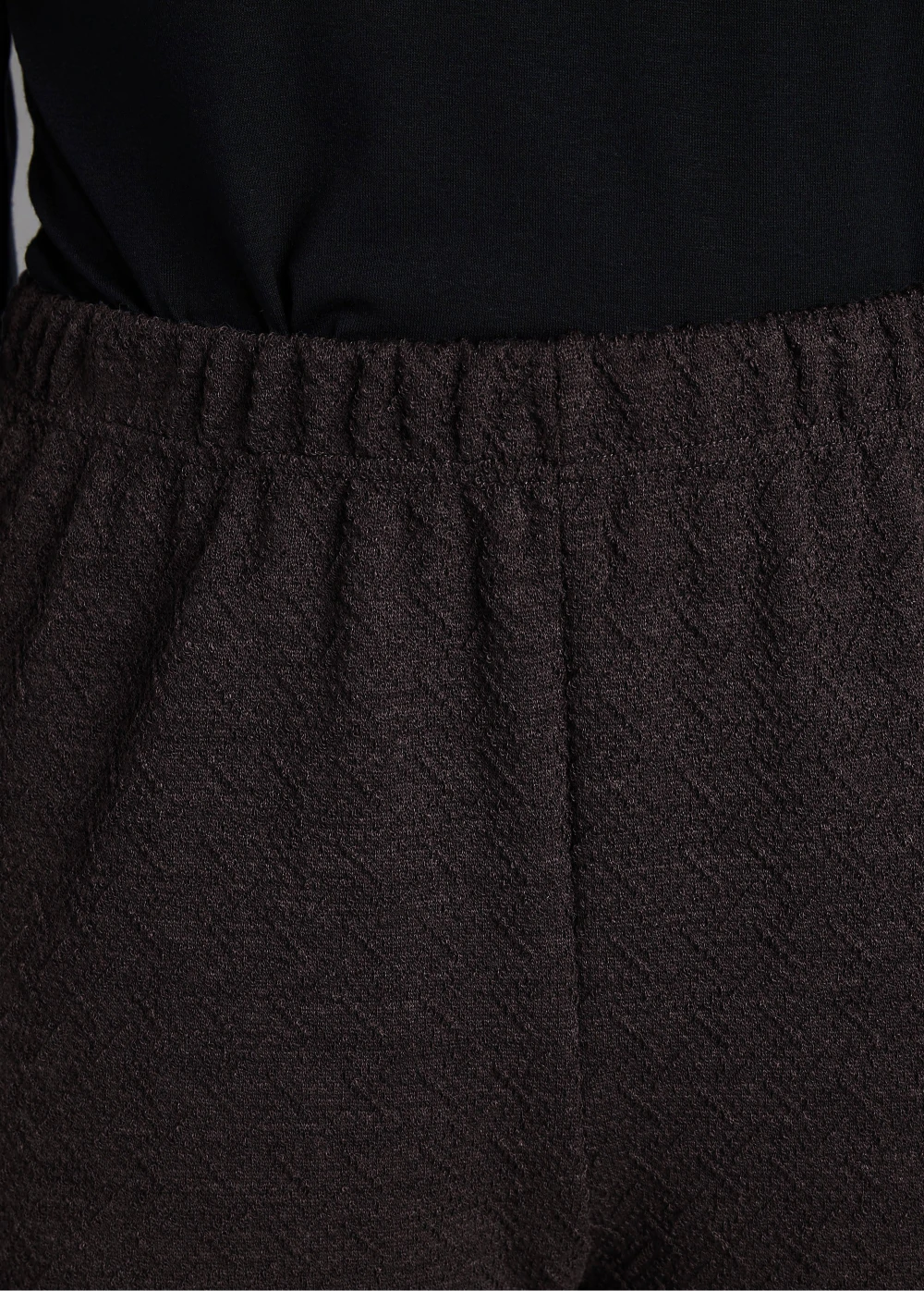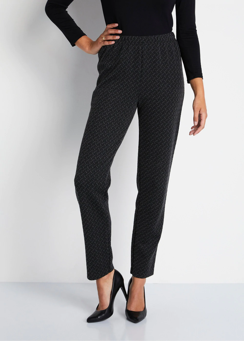Nohavice, hladké alebo žakárové, pružný material obohatený vlnou, elastický pás. Ukončené dvojitým prešitím. Vnútorná dĺžka nohavíc cca 72 cm. Možno prať v práčke na 30 ° C. Hladký materiál: 63% akryl, 27% vlna, 9% polyester, 1% elastan. Žakár: 78% akryl, 12% vlna, 9% polyester, 1% elastan.