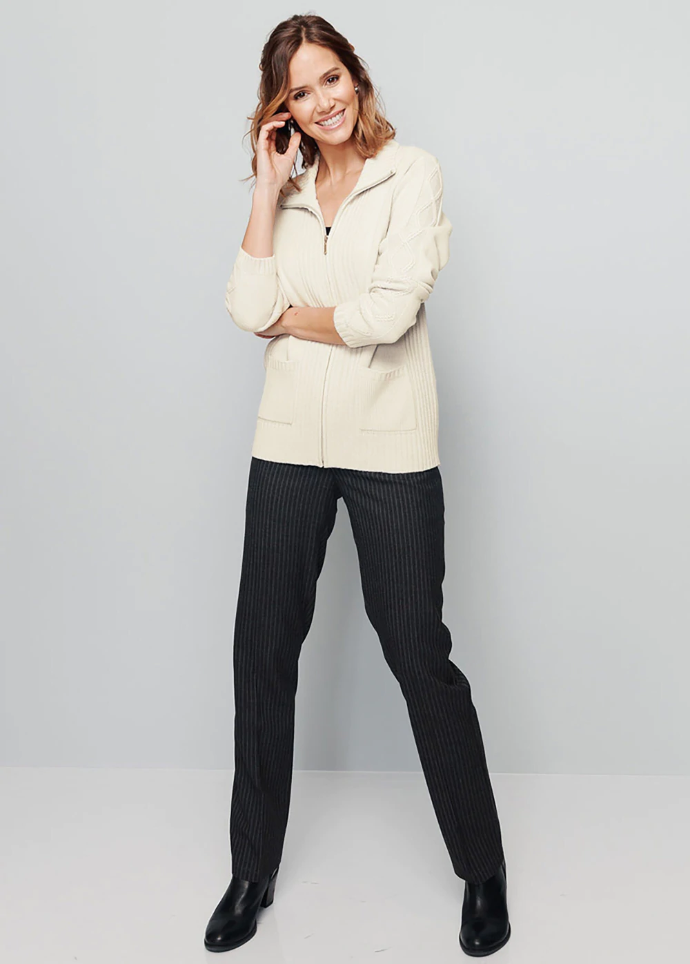 Rozopínateľný sveter vyrobený z hrubého, mäkkého a pohodlného úpletu - ideálny na jeseň a zimu! Vrúbkované prvky na prednej a zadnej strane zoštíhľujúce siluetu a írsky vzor na rukávoch mu dodávajú čaro. Má vnútorný zips, golier s vysokým stojačikom, vysoko šité rukávy, dve našité vrecká, rukávy a spodok sú zakončené lemom. Dĺžka cca 64 cm. Možno prať v práčke na 30°C. Akryl.