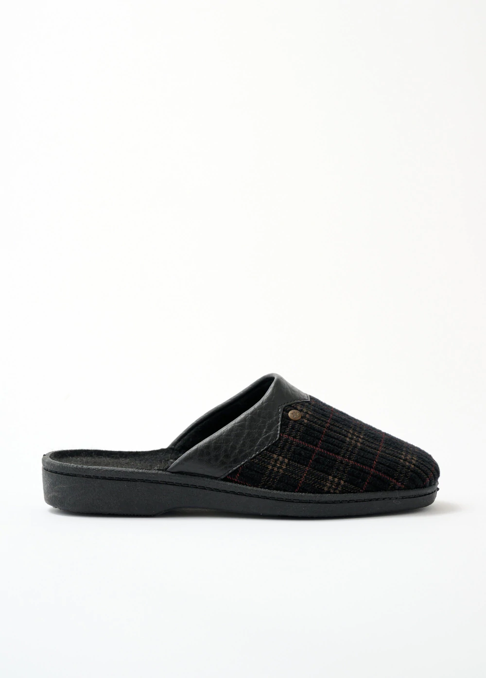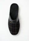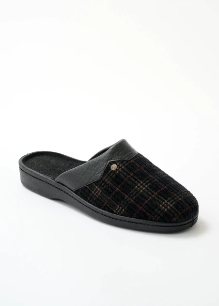 Prepracovaný materiál, plný strih, pohodlný model papúč. Zvršok vyrobený z elegantného menčestru s nápaditým syntetickým prvkom. Filcová stielka a vložka. Protišmyková, vrúbkovaná elastomerová podrážka. Klinový podpätok cca 2,5 cm.