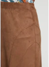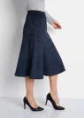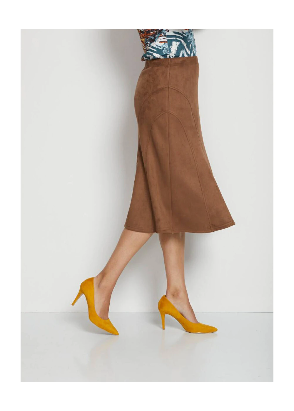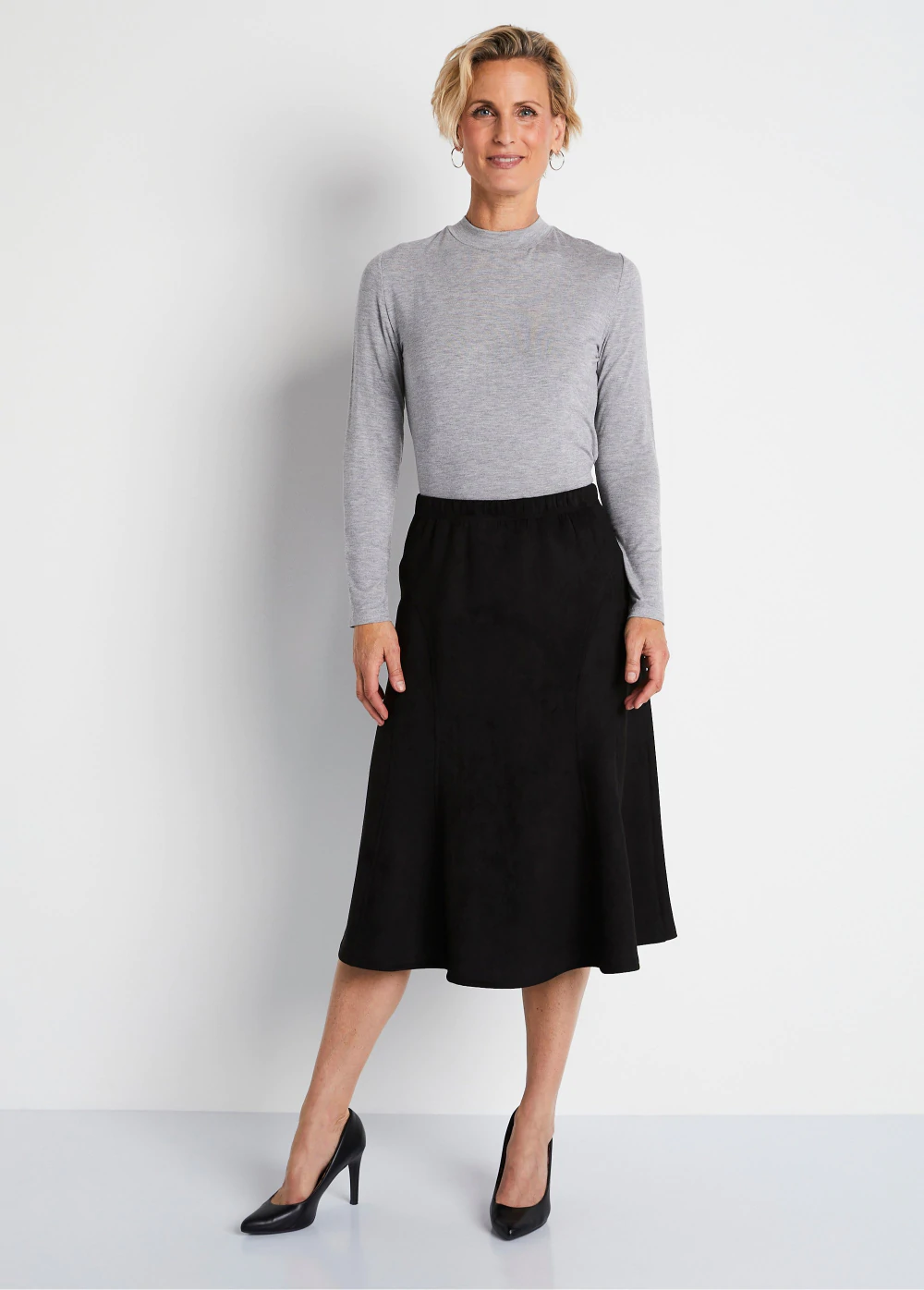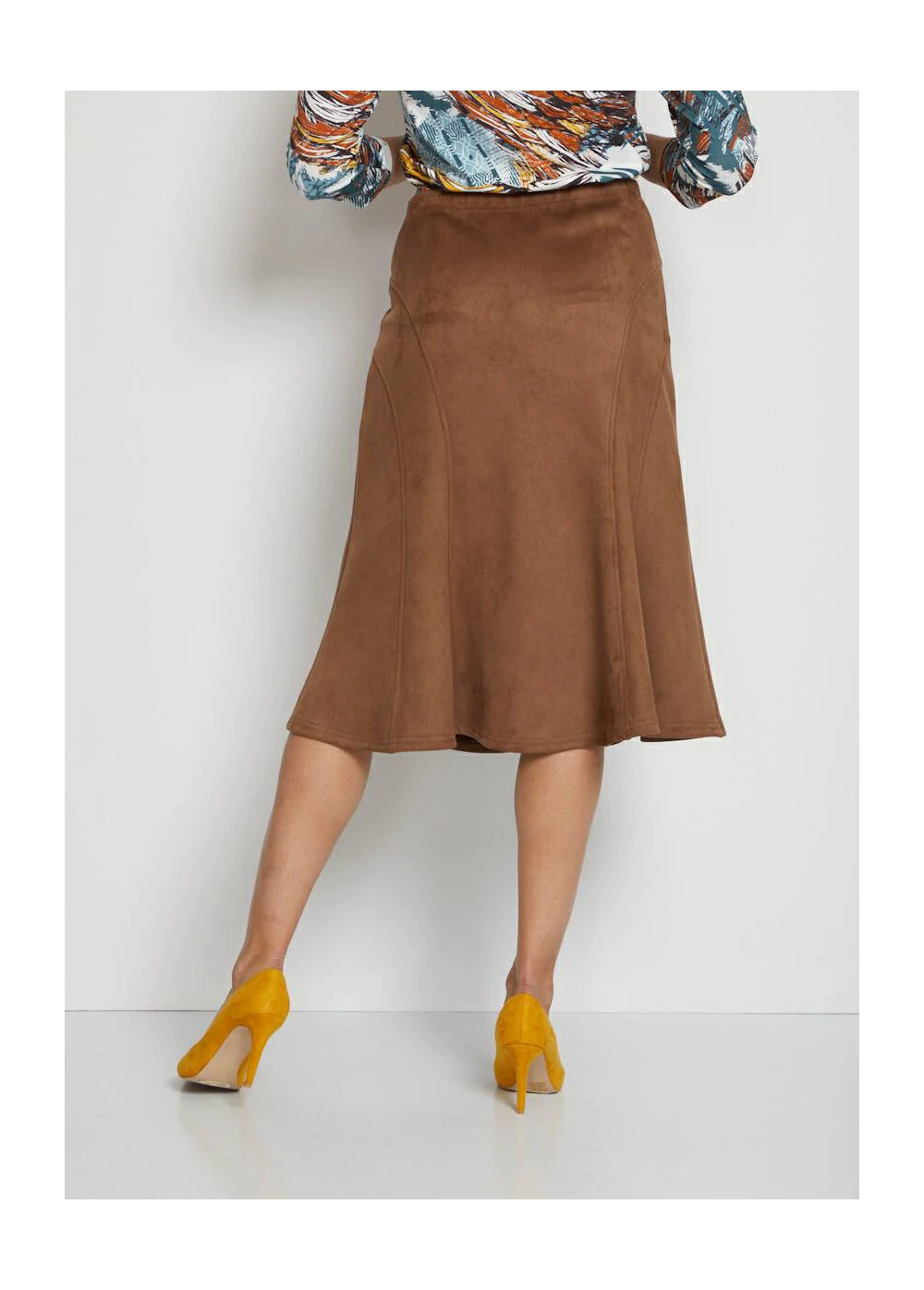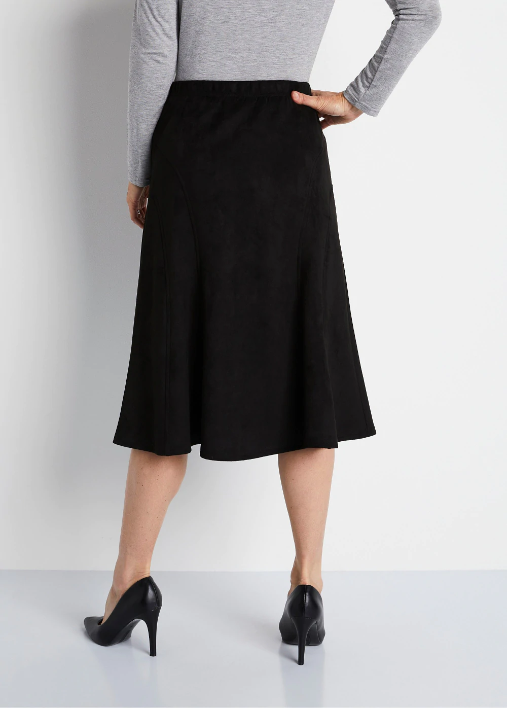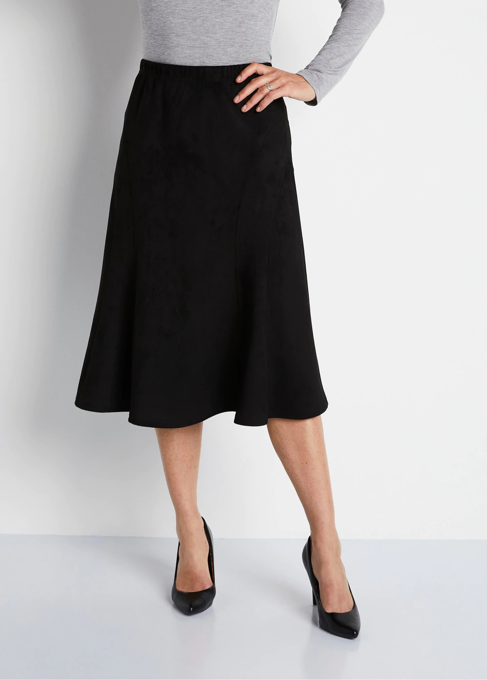 Dlha sukňa z prijemnej, na dotyk zamatovej latky. Originalne strihy vpredu ajvzadu, ktore zoštihluju postavu a dodavaju sukni mierne rozšireny strih. Dvojiteprešivanie. Dĺžka cca 70 cm. Možno prať v pračke na 30°C. Nevyžaduje žehlenie.Semišova latka 93% polyester, 7% elastan.