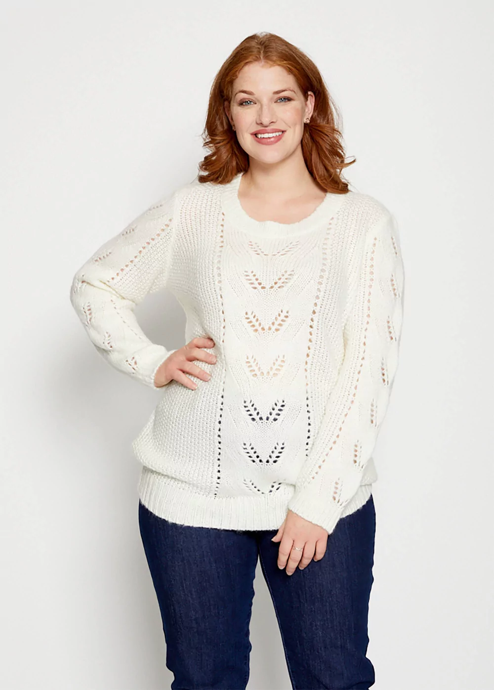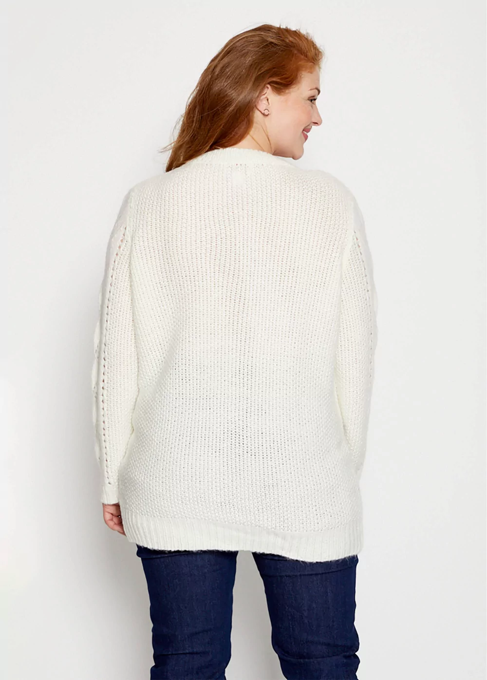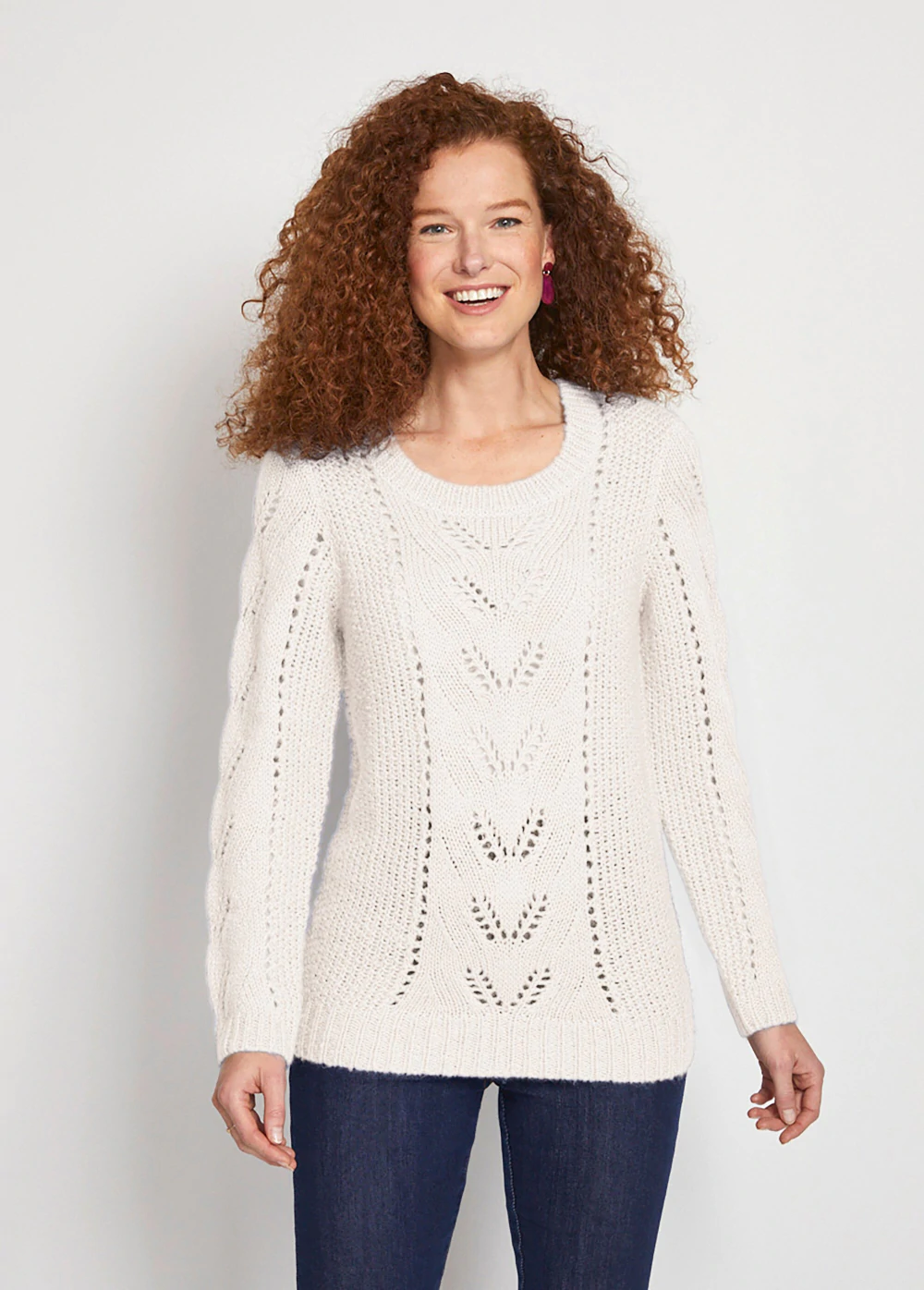Sveter s okrúhlym výstrihom a ryžovým vzorom. Vpredu a na dlhých rukávoch nápadité dierkované vzory. Vrúbkované lemy. Dĺžka cca 62 cm. Možno prať v práčke na 30 ° C. Jemný akrylový úplet príjemný na dotyk.