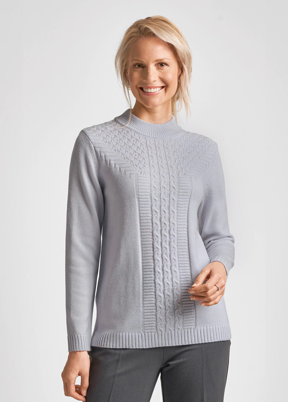 Sveter s dlhým rukávom na všetky príležitosti. Predná strana zdobená nápaditými vzormi a prúžkami. Pod výstrihom sa nachádza jemný štras . Polorolák, vysoko všité rukávy. Džersejový chrbát a rukávy. Okraje sú ukončené rebrovaným lemom. Dĺžka cca 62 cm. Možno prať v práčke na 30 ° C. Akryl.