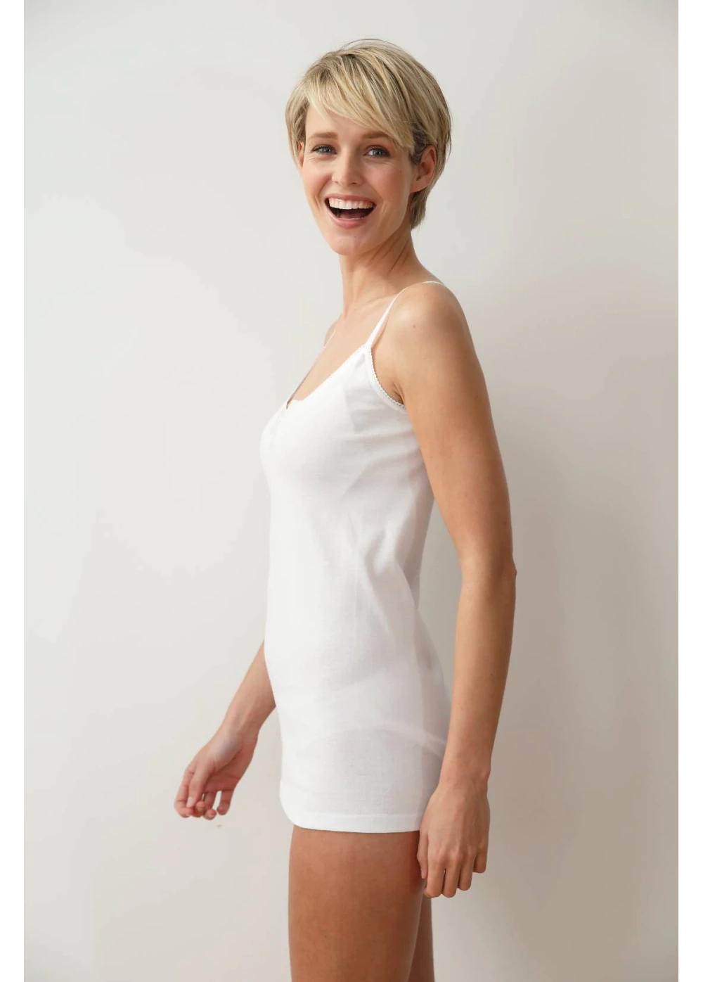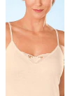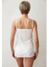 Tričko s tenkými ramienkami s výšivkou vo výstrihu z čistej, rebrovanej, česanej bavlny. Dlhé, priliehajúce k telu. Neviditeľné pod šatami, svetrom, košeľou. Žiadne bočné švy. Dĺžka od 64 do 76 cm. Tričko z česanej bavlny možno prať v práčke na 40 ° C na 30 ° C tričko s prímesou vlny (70% akryl, 30% vlna).