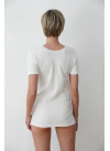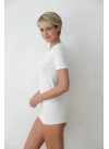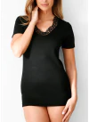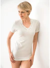 Teplé tričko s krátkym rukávom a krásnou čipkou vo výstrihu, vyrobené zo špeciálnej, dvojitej, husto tkanej látky. Vrchná časť: 70% akryl, 30% teplá vlna. Spodok: prírodne mäkká česaná bavlna. Elastické, saténové lemovanie vzadu, bez bočných švov. Dĺžka od 64 do 76 cm. Možno prať v práčke na 30 ° C.