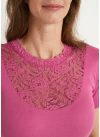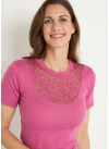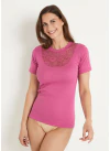 Tričko s krátkym rukávom. Vysoko kvalitný, pohodlný vrúbkovaný material 1 x 1 z česanej bavlny. Široké jarmo s malým golierom z rafinovanej čipky. Žiadne bočné švy. Dĺžka od 64 do 76 cm. Možno prať v práčke na 40 °C. Čistá česaná bavlna.