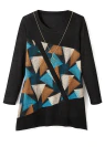 Táto tunika s dlhým rukávomasymetrického strihu dokonalezakryje akékoľvek nedokonalostipostavy. Grafický vzorna prednej strane. Okrúhly výstrihukončený vrúbkovanýmlemom, nápaditá ozdoba,ktorá sa dá odopnúť. Spodnáčasť tuniky a rukávy súdvojito prešívané. Perfektnádĺžka cca 72 cm. Možno praťv práčke na 30°C. Materiál:95% polyester, 5% elastan.