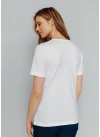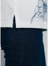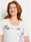 Tričko. Vpredu kvetinová nášivka s trblietavými flitrami, zadná časť hladká. Okrúhly výstrih s lemom, krátke rukávy, bočné rozparky. Dĺžka cca 65 cm. Možno prať v práčke na 30°C. Džersej z čistej česanej bavlny.